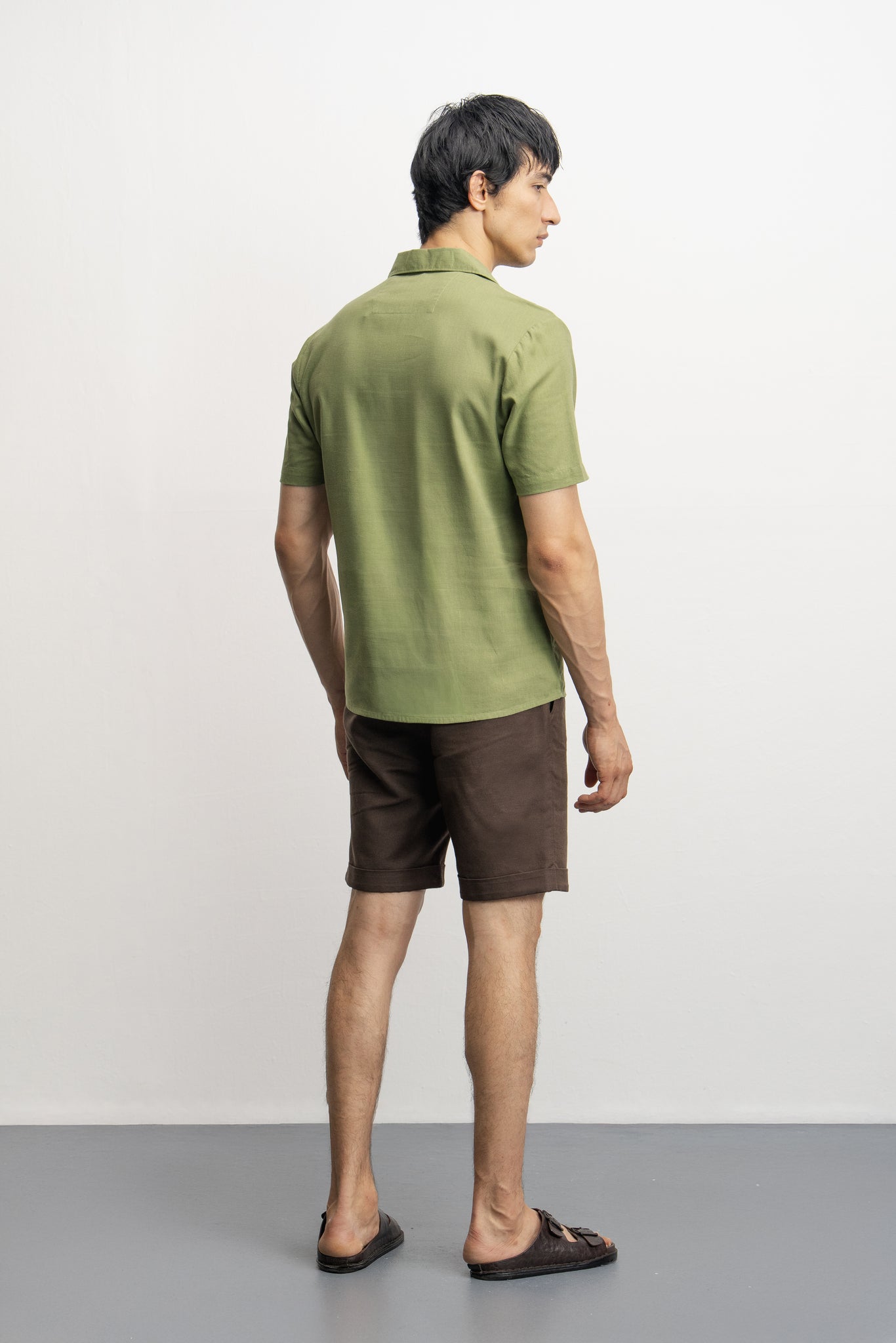 Regular fit  half sleeves drop shoulder shirt made up of lyocell linen fabric. Featuring a lapel collar, a zip up front and short sleeves .| OLIVE GREEN