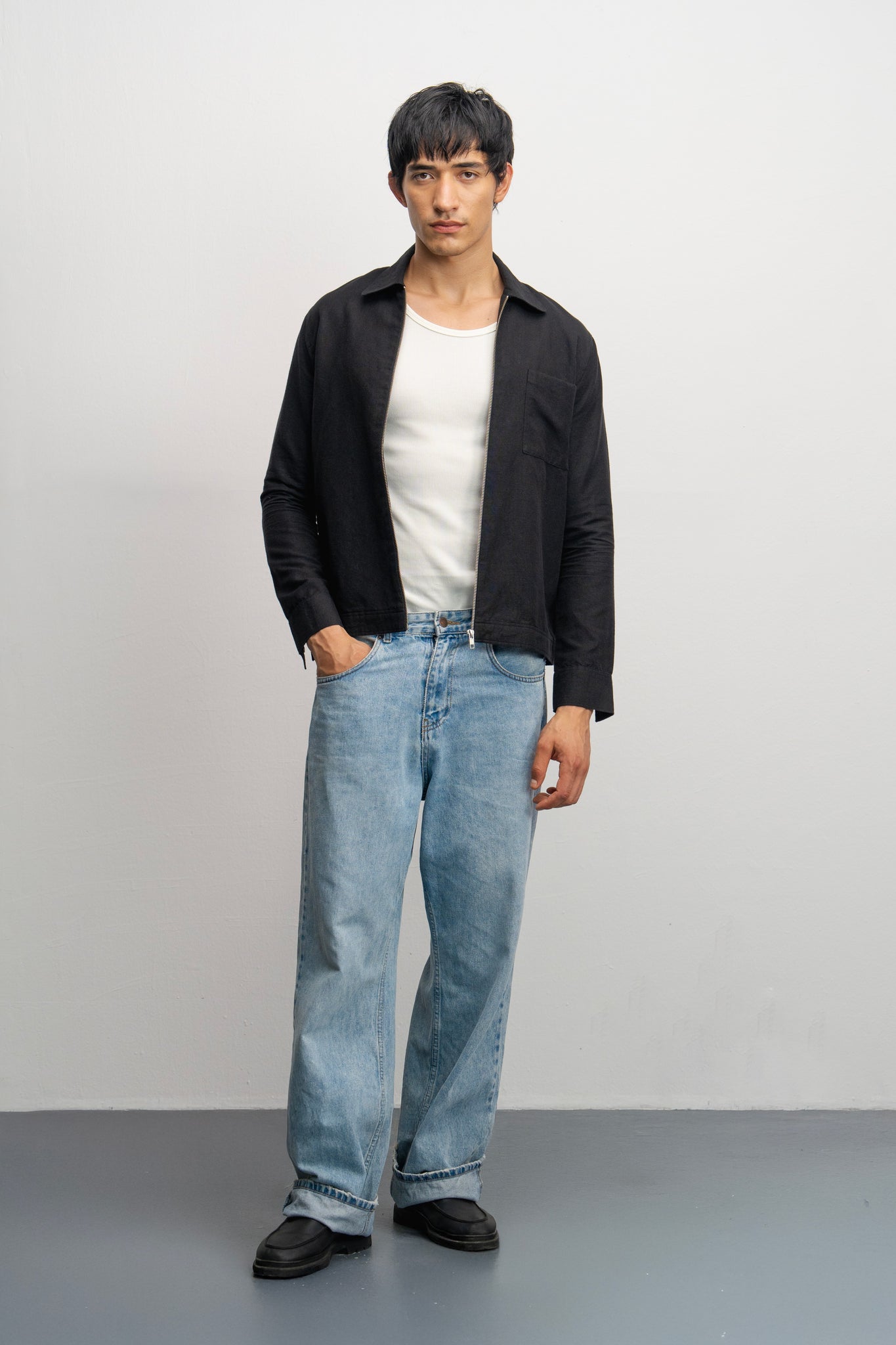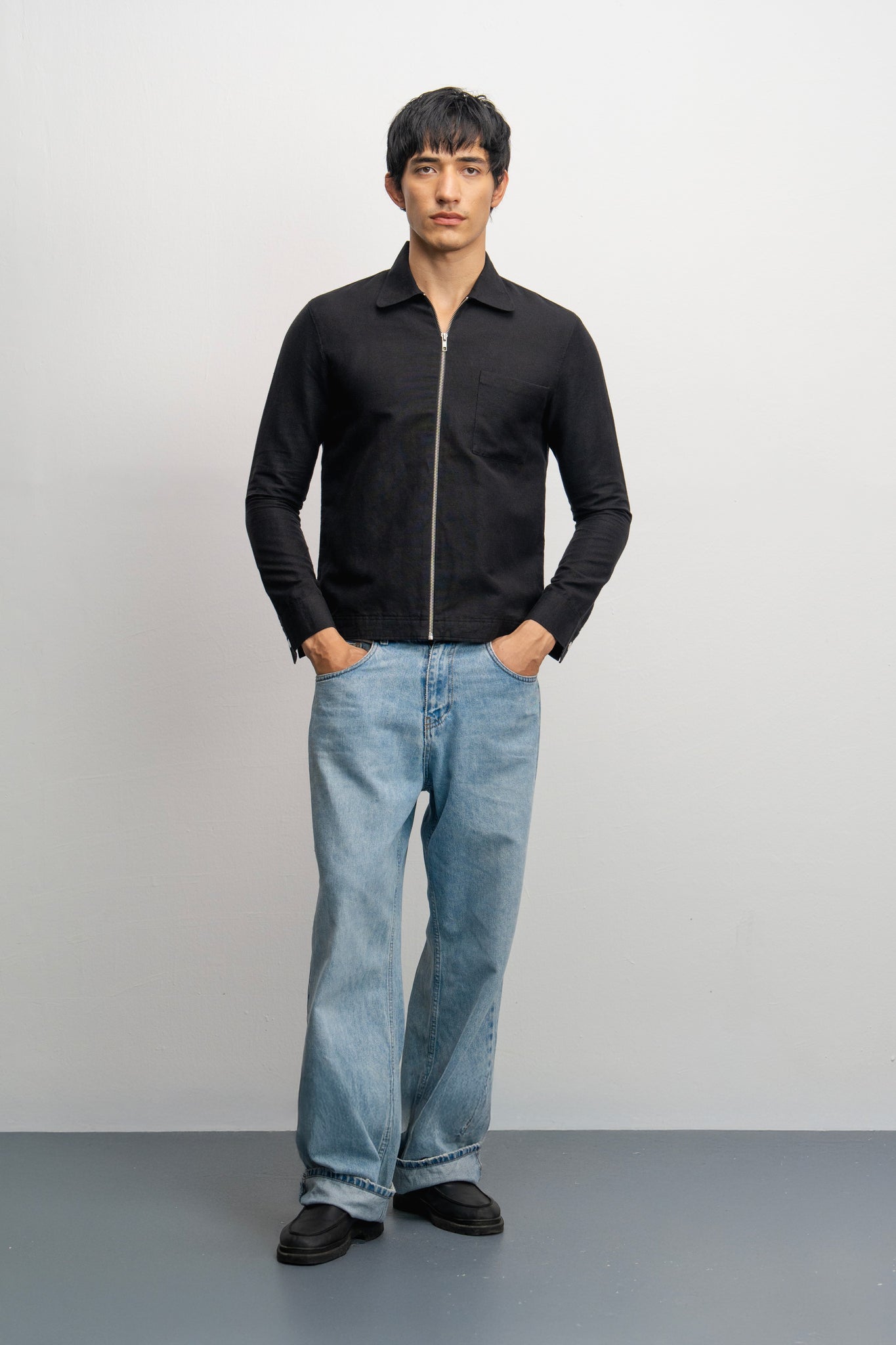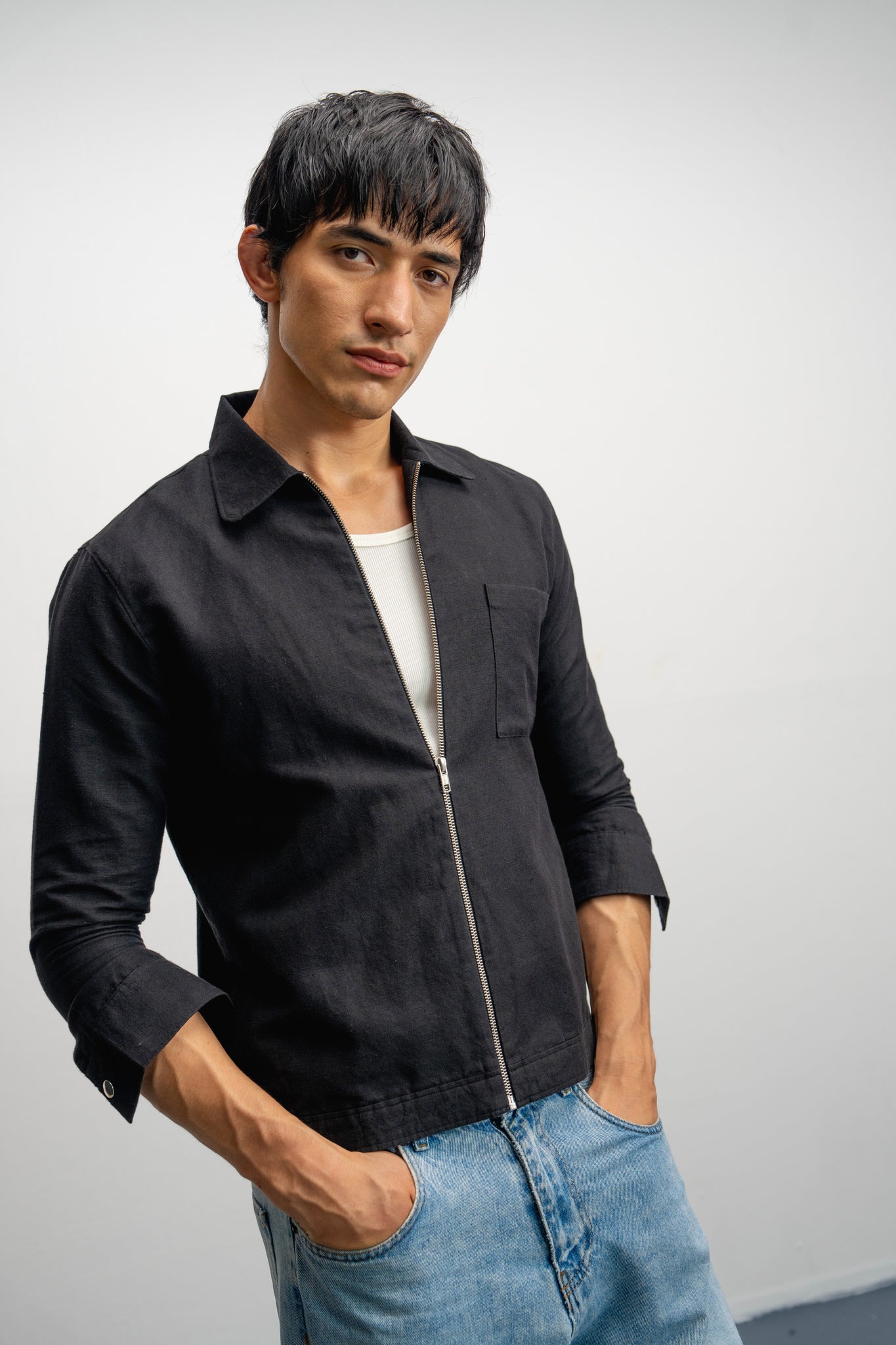 European linen jacket . Front zip closer patch pocket on the chest. Snap buttoned cuffs. minimal detail. | BLACK