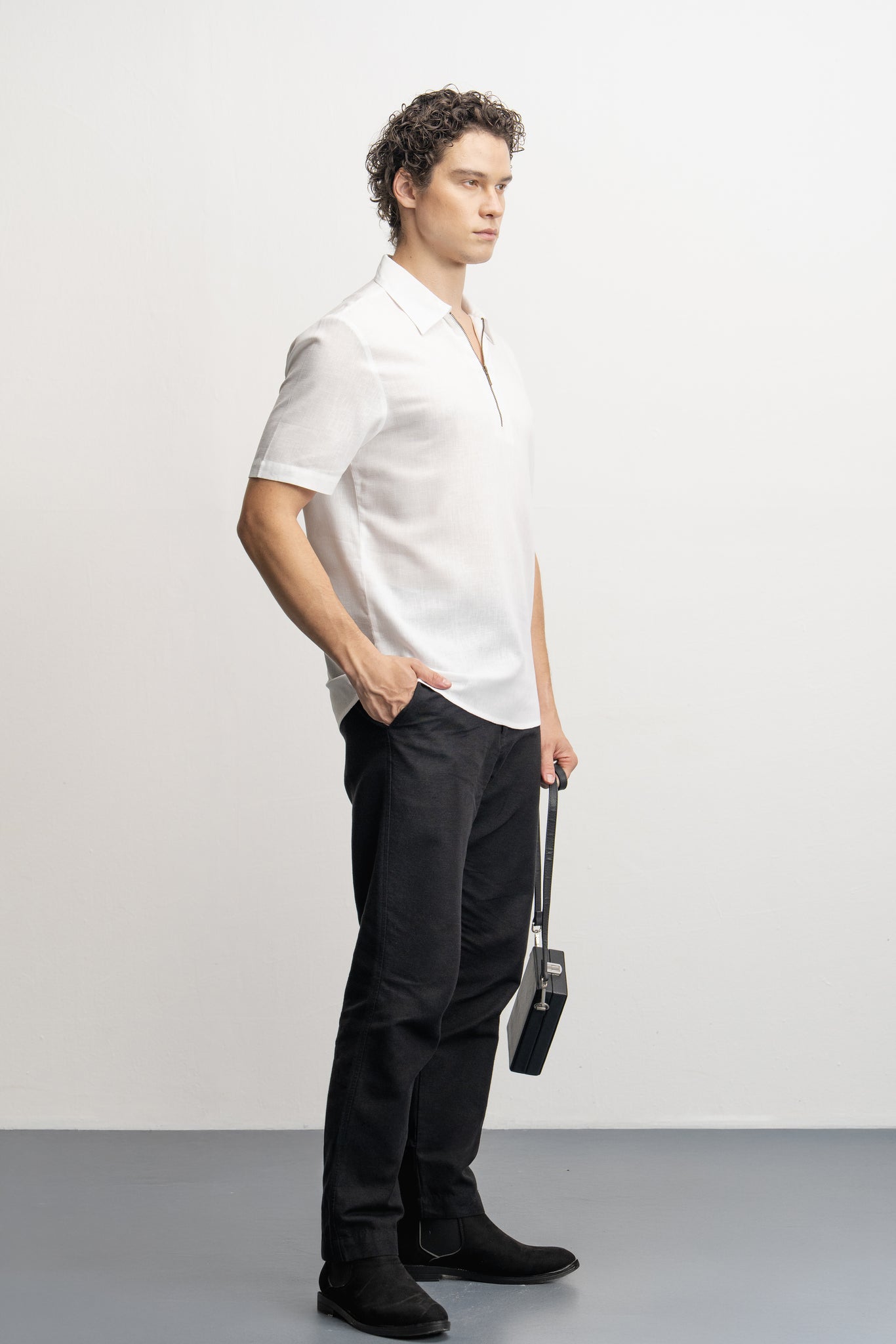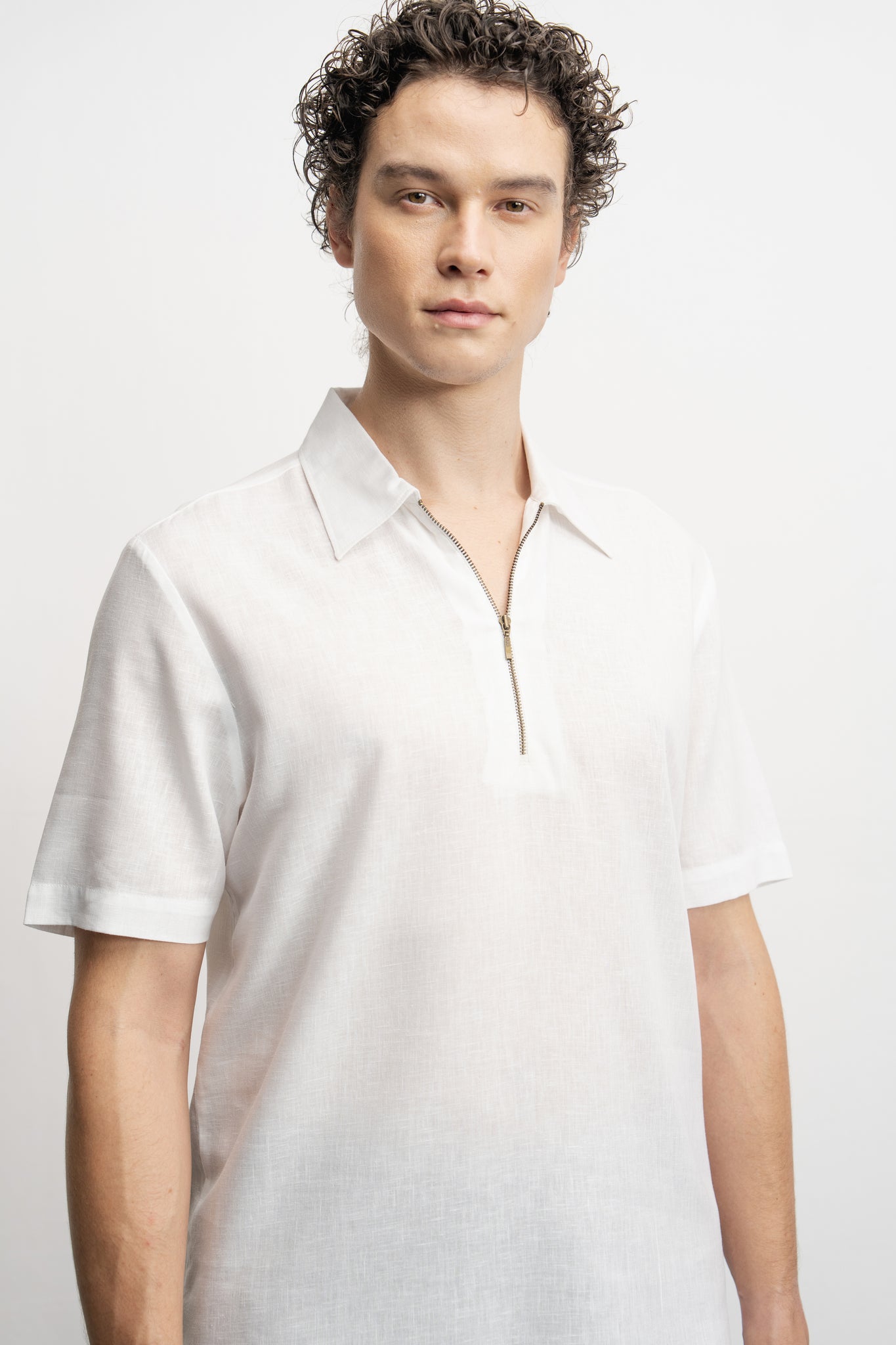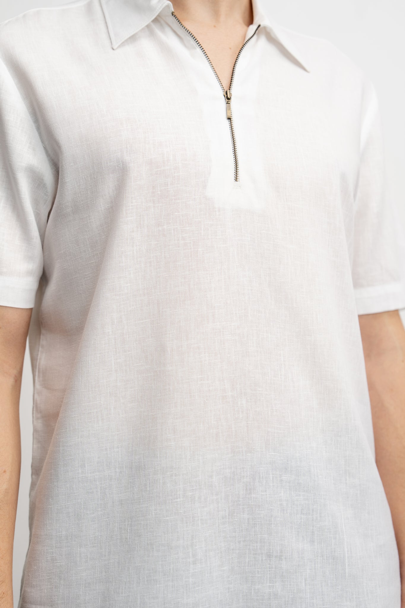 Regular fit half sleeves drop shoulder shirt made up of lyocell linen fabric. Featuring a lapel collar, a zip up front and short sleeves .| WHITE