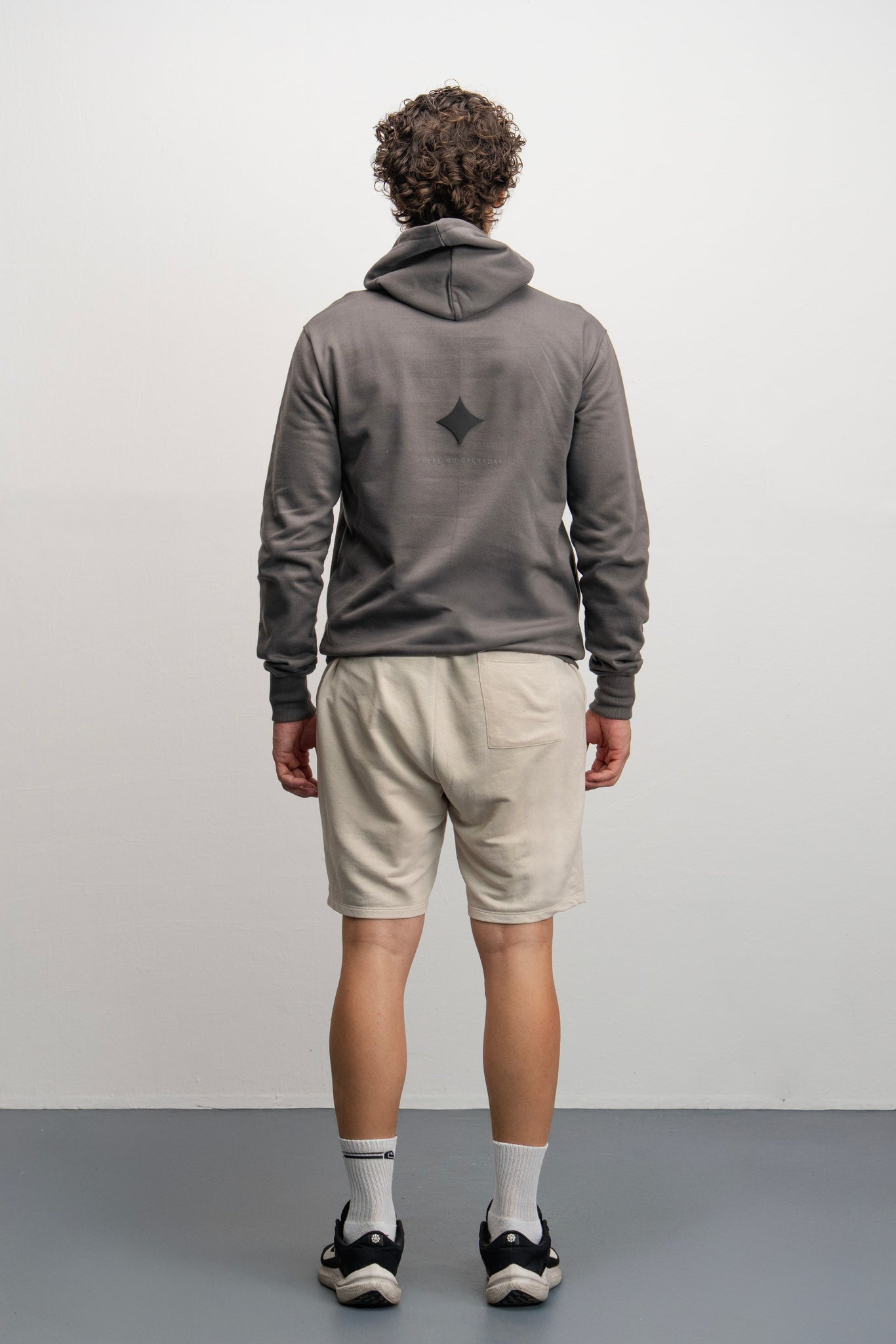 Relaxed fit pullover hoodie, snap button on the hood. A minimalist look with streamlined pocket with snap button detailing | GREY