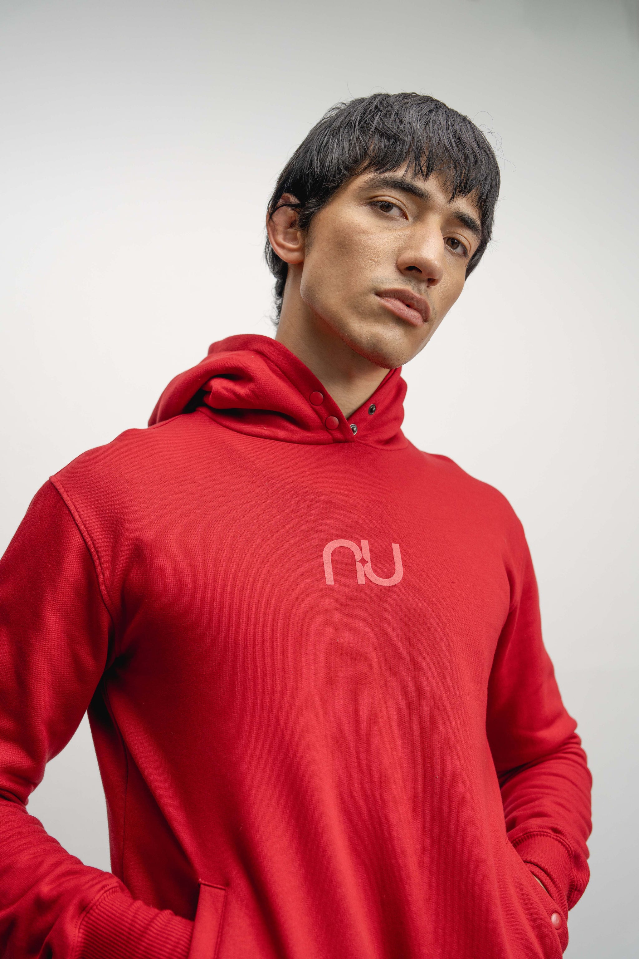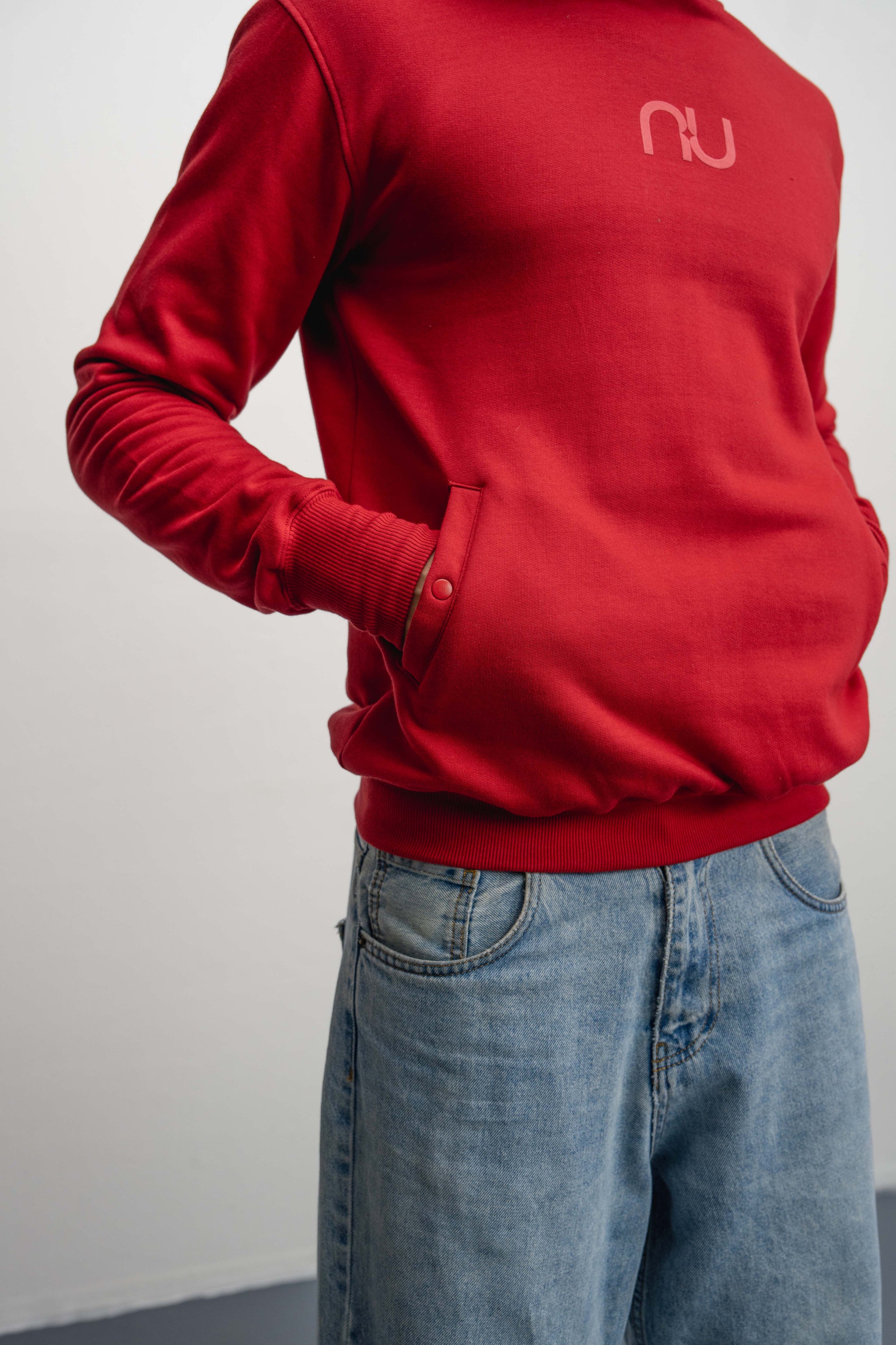 Relaxed fit pullover hoodie, snap button on the hood. A minimalist look with streamlined pocket with snap button detailing | CHERRY RED